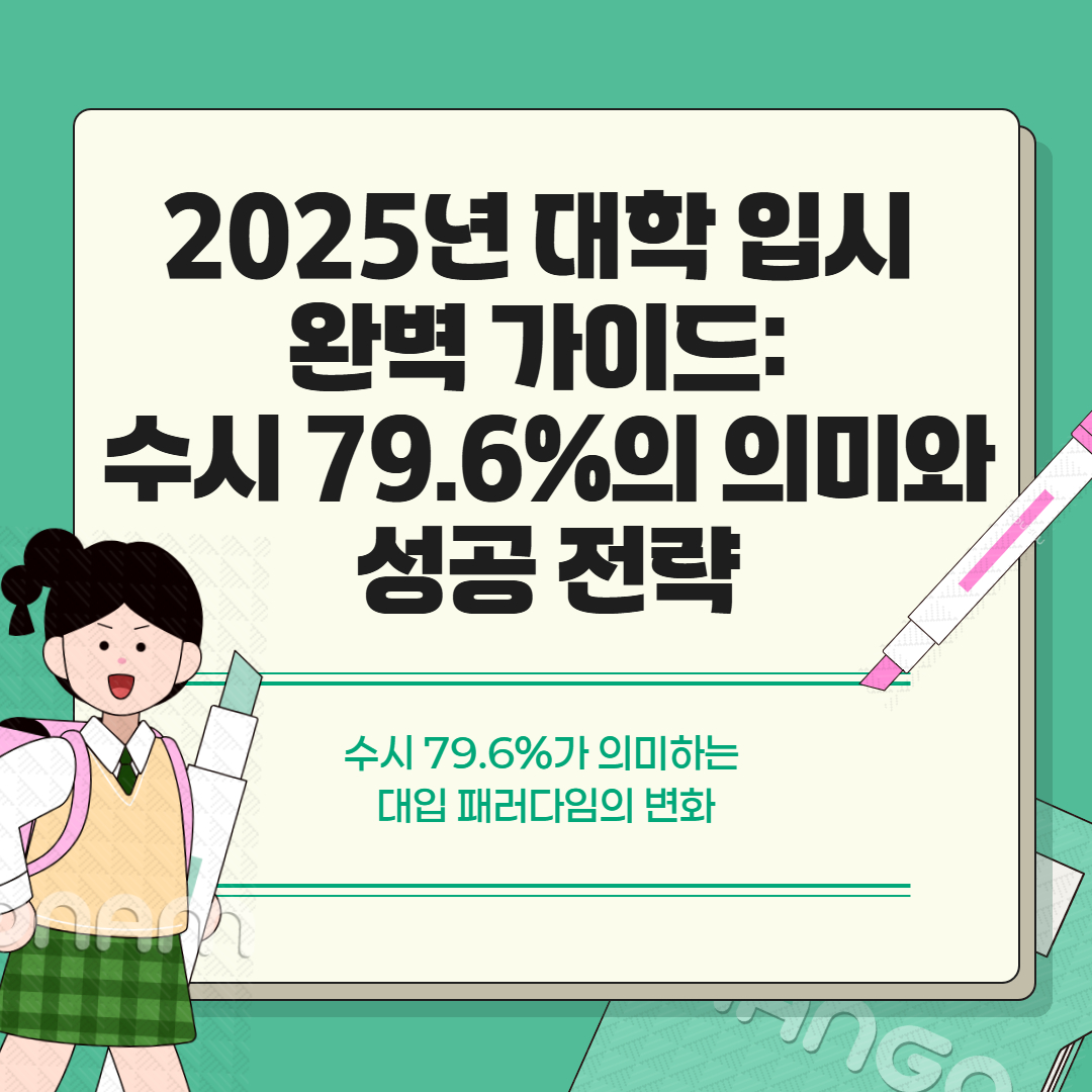 2025년 입시는 수시의 비중이 더욱 높아지고, 의대 증원 등 다양한 변수가 존재하는 복잡한 양상을 보이고 있습니다. 성공적인 입시를 위해서는 정확한 정보 수집과 치밀한 전략 수립, 그리고 끝까지 포기하지 않는 의지가 필요합니다. 변화하는 입시 환경에 능동적으로 대응하여 목표하는 대학 합격의 꿈을 이루시기 바랍니다.